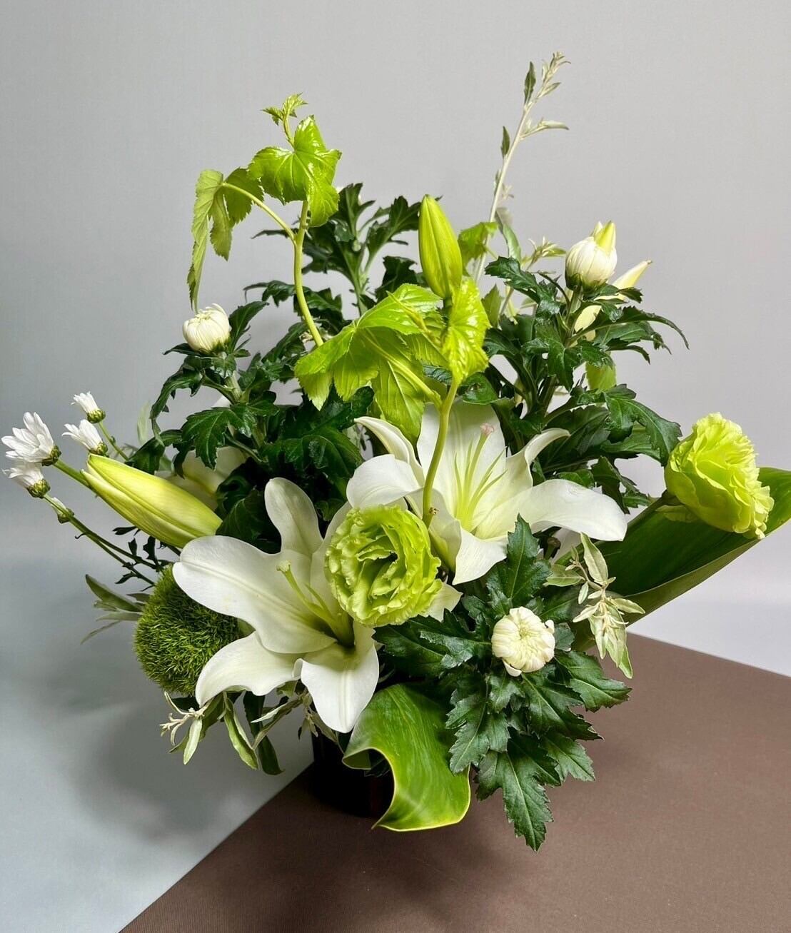 白いお花をメインに哀悼の意を込め、優しい気持ちで想いを伝えます。