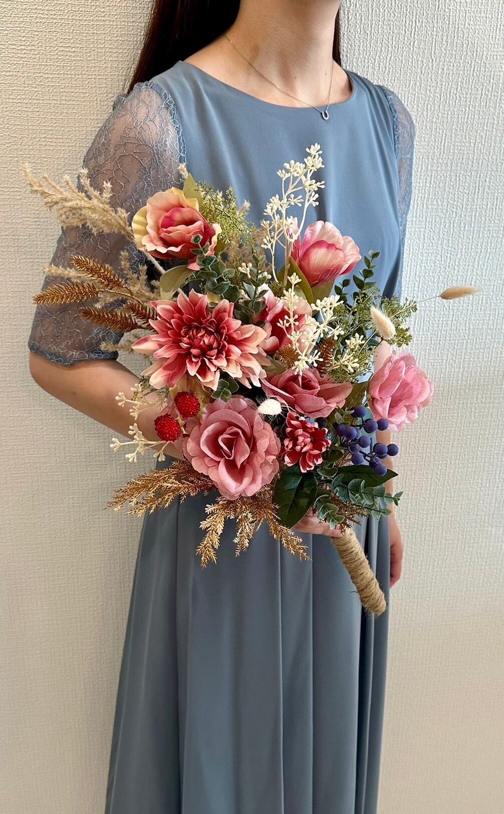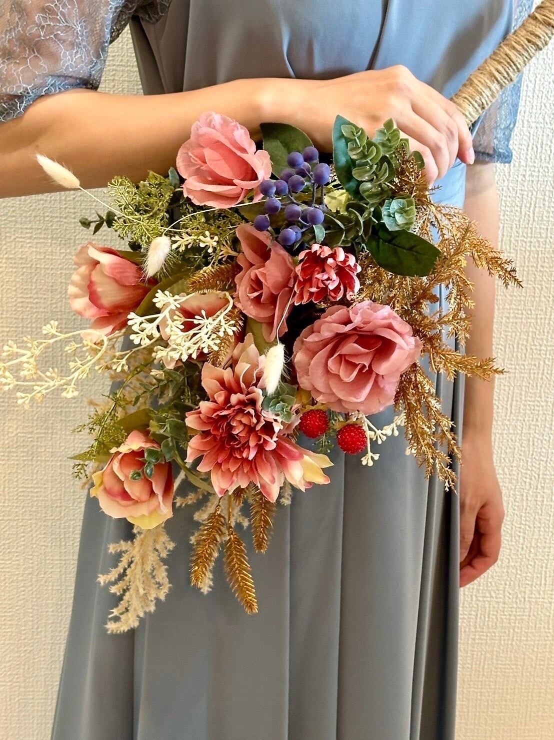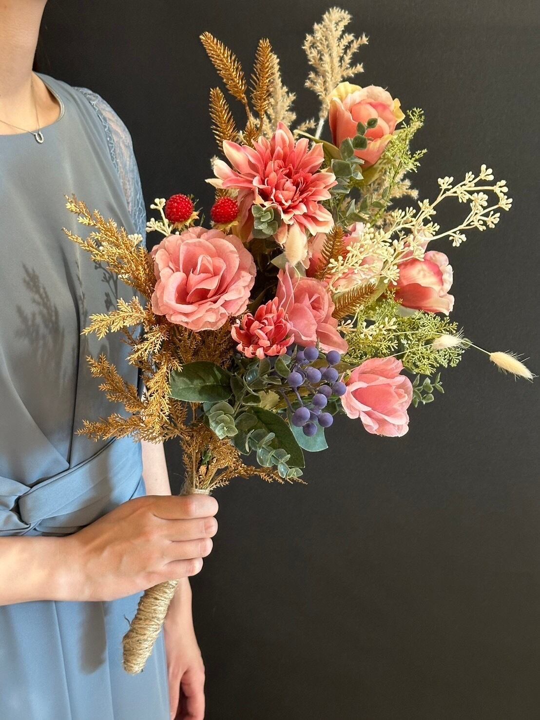 ダスティピンクのバラをメインにダリアとトルコキキョウを入れ、本物のように瑞々しさが人気のberryをアクセントに使用しました。