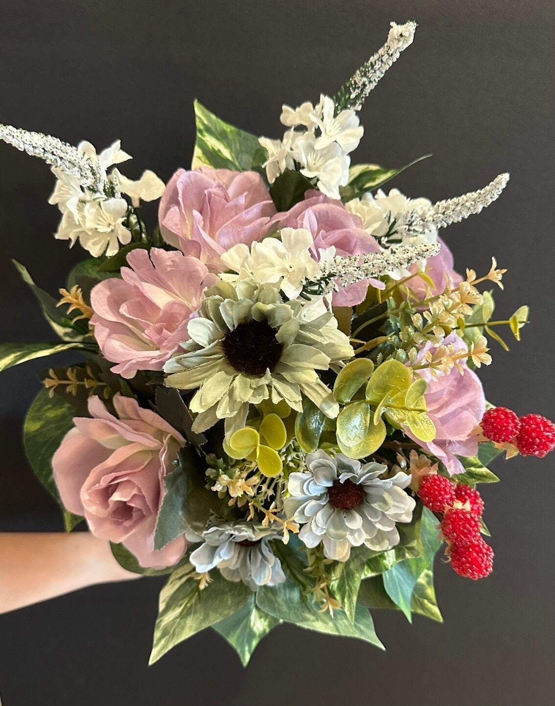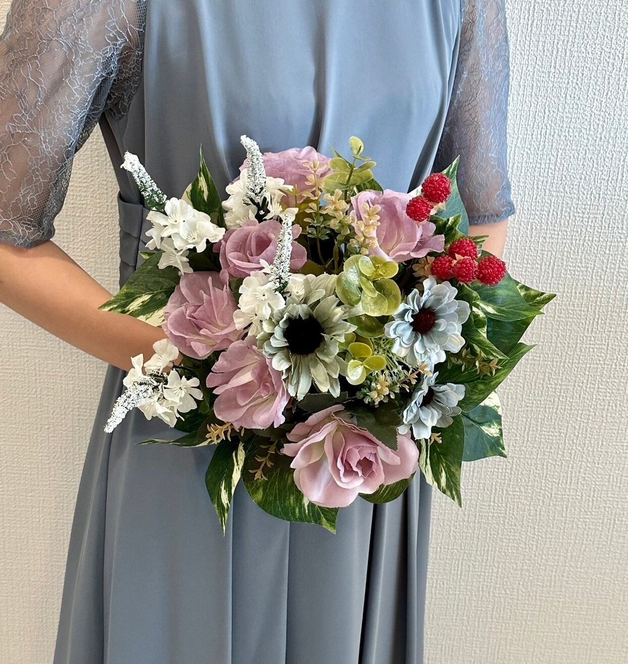 ほんのりスモーキーで形が異なる花々をミックスしてメリハリを強調。